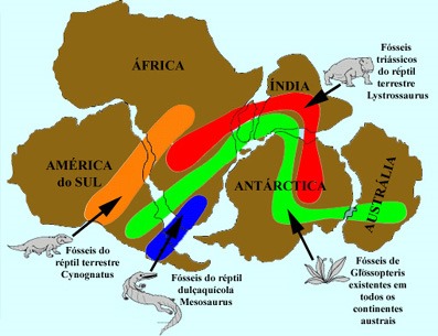 A teoria de Wegener baseava-se no ajuste, bastante evidente, entre a costa ocidental de África e a oriental da América do Sul, o que já tinha sido constatado, três séculos antes, por Abraham Ortelius. Todavia, Wegener utilizou, também, informações referentes a estruturas geológicas e a fósseis de plantas e animais encontrados em África e na América do Sul, que indicavam terem vivido em continuidade geográfica embora, actualmente, estejam separados pelo Atlântico Sul. Para este cientista, a presença de fósseis idênticos em ambos os continentes não podia ser explicada por qualquer processo de locomoção (isto é, seria fisicamente impossível para esses organismos atravessarem o oceano a nadar, ou transportados pelo vento, ou derivando em objectos flutuantes). Assim, o facto aludido surgia como a evidência mais ressaltante de que os continentes sul-atlânticos tinham outrora estado juntos, tendo-se separado posteriormente com a instalação do oceano Atlântico.