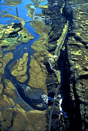 Vista aérea da área de Thingvellir, na Islândia, onde é possível ver uma zona de fissura que corresponde à exposição subaérea da crista média atlântica. Á direita da fissura está a placa norte-americana e à esquerda a placa euroasiática.Na parte superior da fotografia é visível o Lögberg, primeiro parlamento da Islândia, fundado no ano 930. (Oddur Sigurdsson, National Energy Authority, Iceland.) |