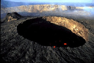 Cratera do Erta Ale, na Etiópia, um dos vulcões activos da zona do rifte este africano, fotografado em Fevereiro de 1994. Os dois vulcanólogos de fato vermelho que estão no bordo da cratera proporcionam uma boa escala. A cor vermelha no interior da cratera corresponde a lava fundida emergindo através da lava solidificada, negra. (Fotografia: Jacques Durieux, Groupe Volcans Actifs). |