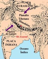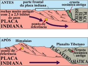 Nesta colisão, ocorrida há 50 milhões de anos, a placa euroasiática acabou por obductar a placa indiana. Após a colisão, a convergência das placas deu origem aos Himalaias (cujo ponto mais alto se localiza a 8 854m de altitude), obrigando também ao levantamento do planalto tibetano (cuja altitude média é de 4 600m).