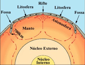 Esquema do funcionamento das células de convexão no manto. Por volta dos 700km de profundidade os blocos de crusta oceânica são fundidos, sendo posteriormente homogeneizados no manto. Os materiais mantélicos aquecidos junto ao núcleo externo sobem nos ramos ascendentes das células de convexão até junto da litosfera, indo condicionar a existência de riftes. (adaptado de: Kious e Tilling, This Dynamic Earth, USGS ws) |