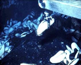 As grandes dimensões das ameijoas gigantes ressaltam quando comparadas com as mãos dos investigadores que as sustêm. (William R. Normark, USGS.) |