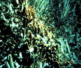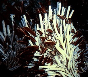 Colónia de vermes fotografada a 13° N na East Pacific Rise. ( Richard A. Lutz, Rutgers University, New Brunswick, New Jersey.) |