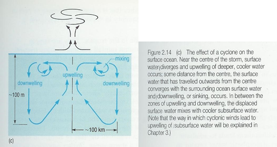 Os ciclones não afectam o oceano apenas à superfície. Junto ao centro da tempestade o vento provoca uma divergência nas águas superficiais e as águas profundas, mais frias, afloram para as substituir. Assim os ciclones não são só afectados pela temperatura da superfície do mar, mas também a modificam, sendo a trajectória de um ciclone marcada por uma temperatura da superfície do oceano anómala (baixa). Esta temperatura pode chegar a ser 5ºC inferior à temperatura das águas circundantes.