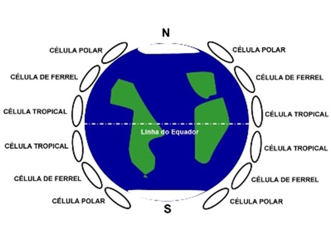 Dessa forma, se considerarmos que os raios solares atingem a Terra de forma diferenciada ao longo de sua extensão, é possível perceber a dinâmica da movimentação das massas de ar a nível global. Temos, assim, a formação das células atmosféricas, que se dividem em três: a célula Tropical, a célula de Ferrel e a célula Polar. Observe o esquema abaixo: